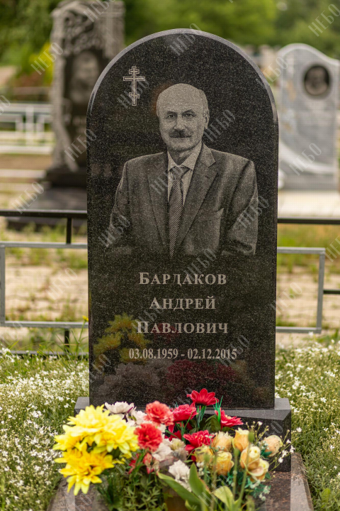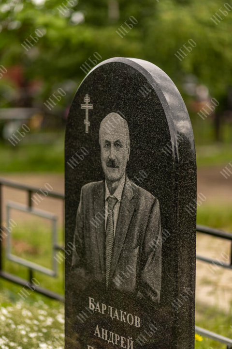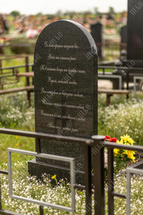 Христианский памятник выполнен в лаконичном черном цвете, сочетает в себе фигурную гранитную плиту и открытое надгробие. Формы и размеры памятника подобраны специалистами с учетом нагрузки и визуального восприятия ритуального изделия. Мягкие изгибы контура стелы придают памятнику индивидуальность, в то же время не выходя за рамки православных канонов.