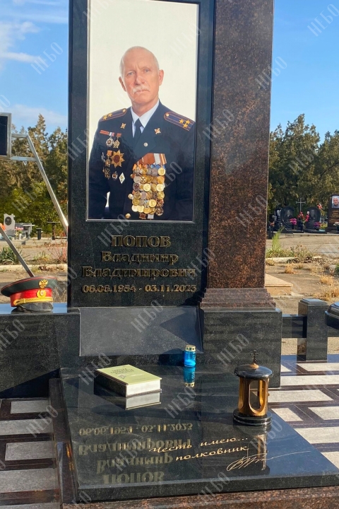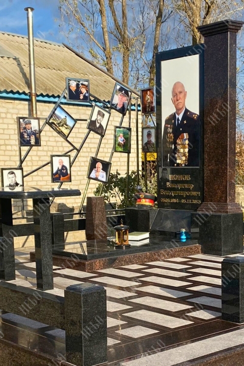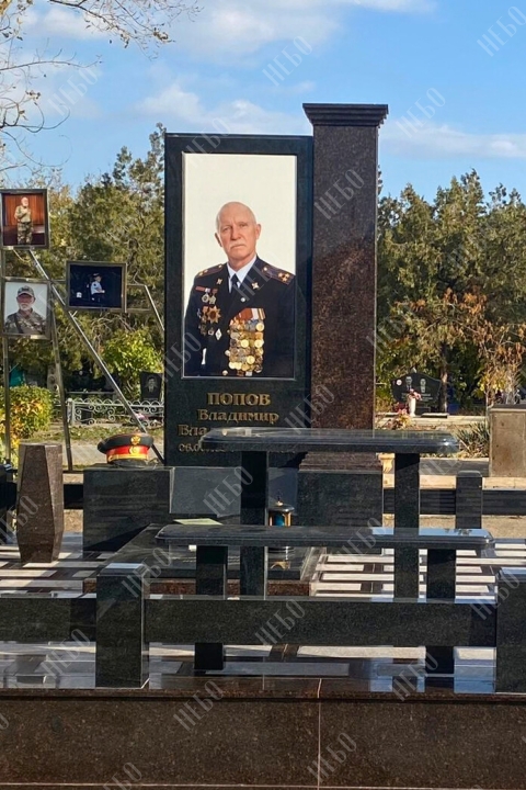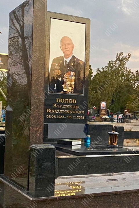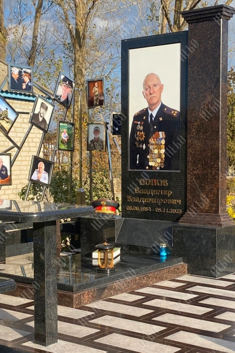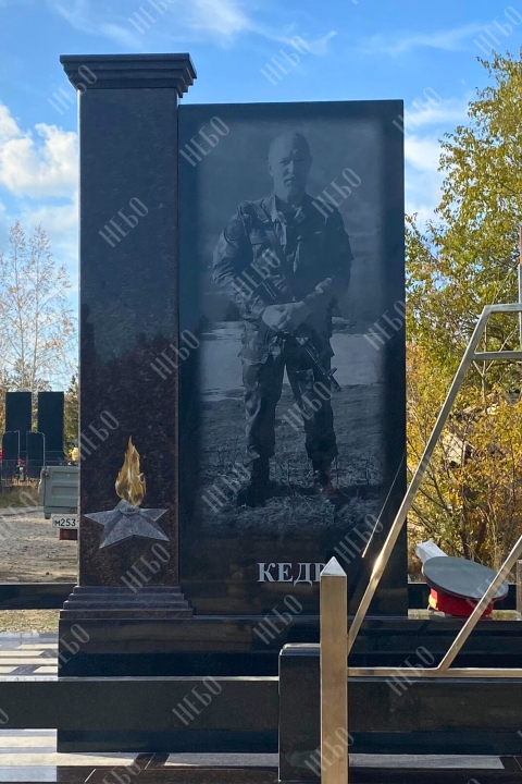 Памятник выполнен из полированного темного гранита двух цветов: черного карельского и коричневого дымовского. Композицию дополняет цветной портрет из керамогранита, лампада, ваза и надпись, выполненная золотым тиснением.
